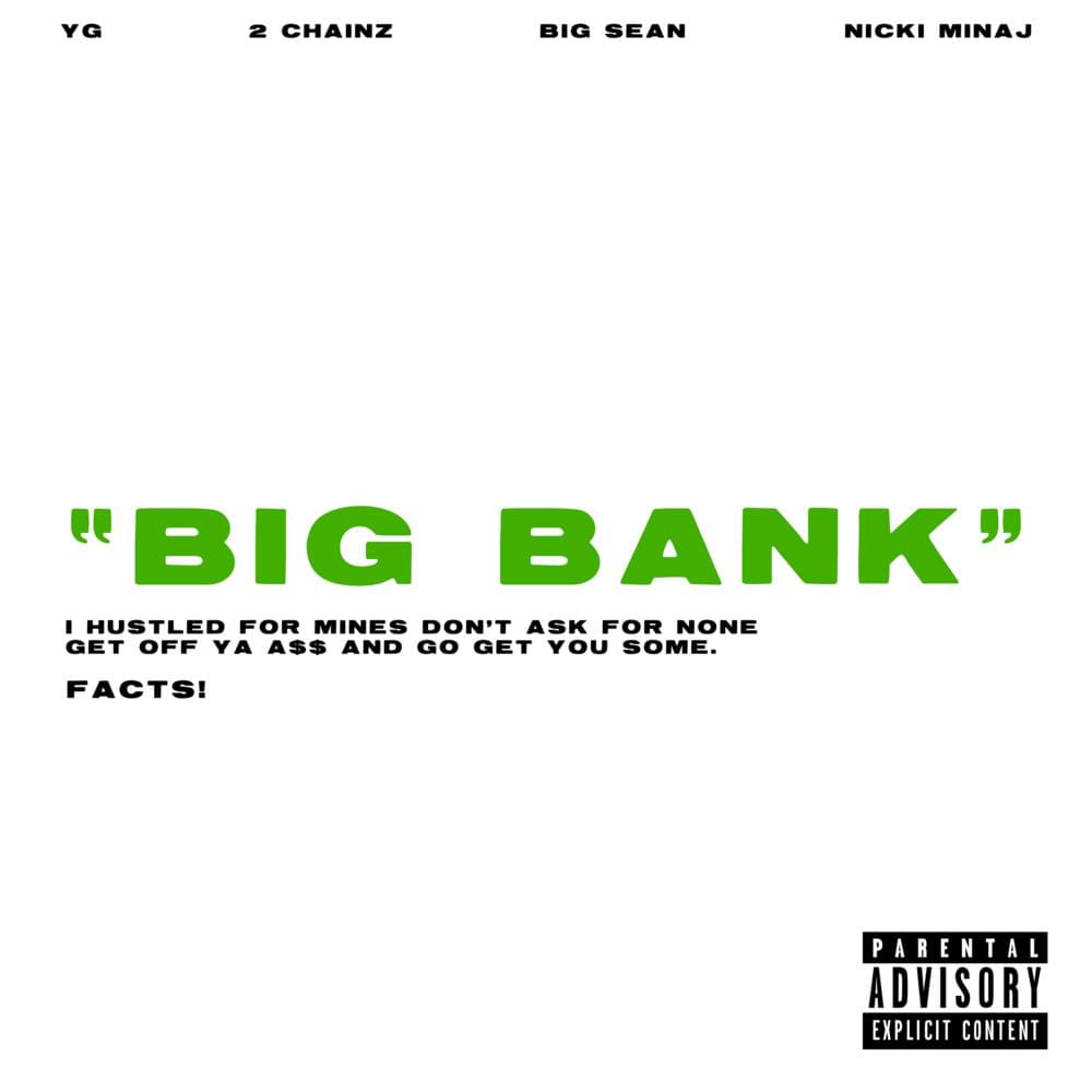 Big Bank” is a song recorded by American rapper YG featuring 2 Chainz, Big Sean and Nicki Minaj. Produced by DJ Mustard, it was released on May 25, 2018, as the second single from YG’s third studio album, Stay Dangerous (2018).